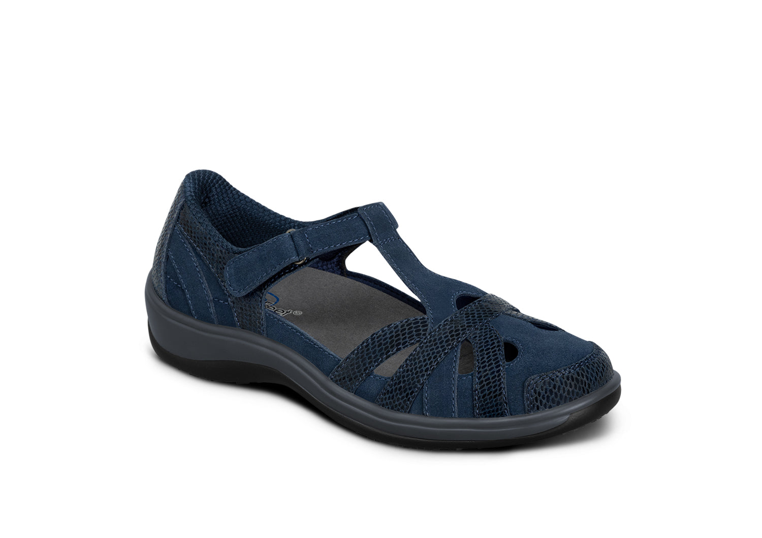 This airy Mary Jane gently wraps feet in suede and patent leather from the padded straps and heel to the stylish closed toe & perfect protection for spring or fall months. Adjustable straps open on both sides. making it easy to reach down and put Juno on. Heel-to-toe. customizable Ortho-Cushionâ„¢ System support and comfort. with extra depth. keeps feet pain-free all day.