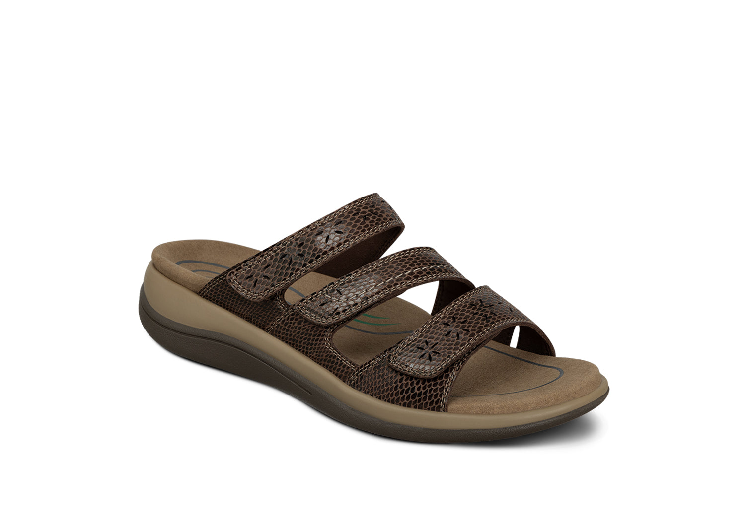 Every comfy strap on our pretty three-strap slide completely opens for true "step-right-in" ease and adjustability that forms to every curve and bump of your foot. Orthofeet's innovative comfort engineering makes going out pain-free. with a foot-hugging fit that keeps you happily in your sandals. not sliding out. for carefree fun under the sun.